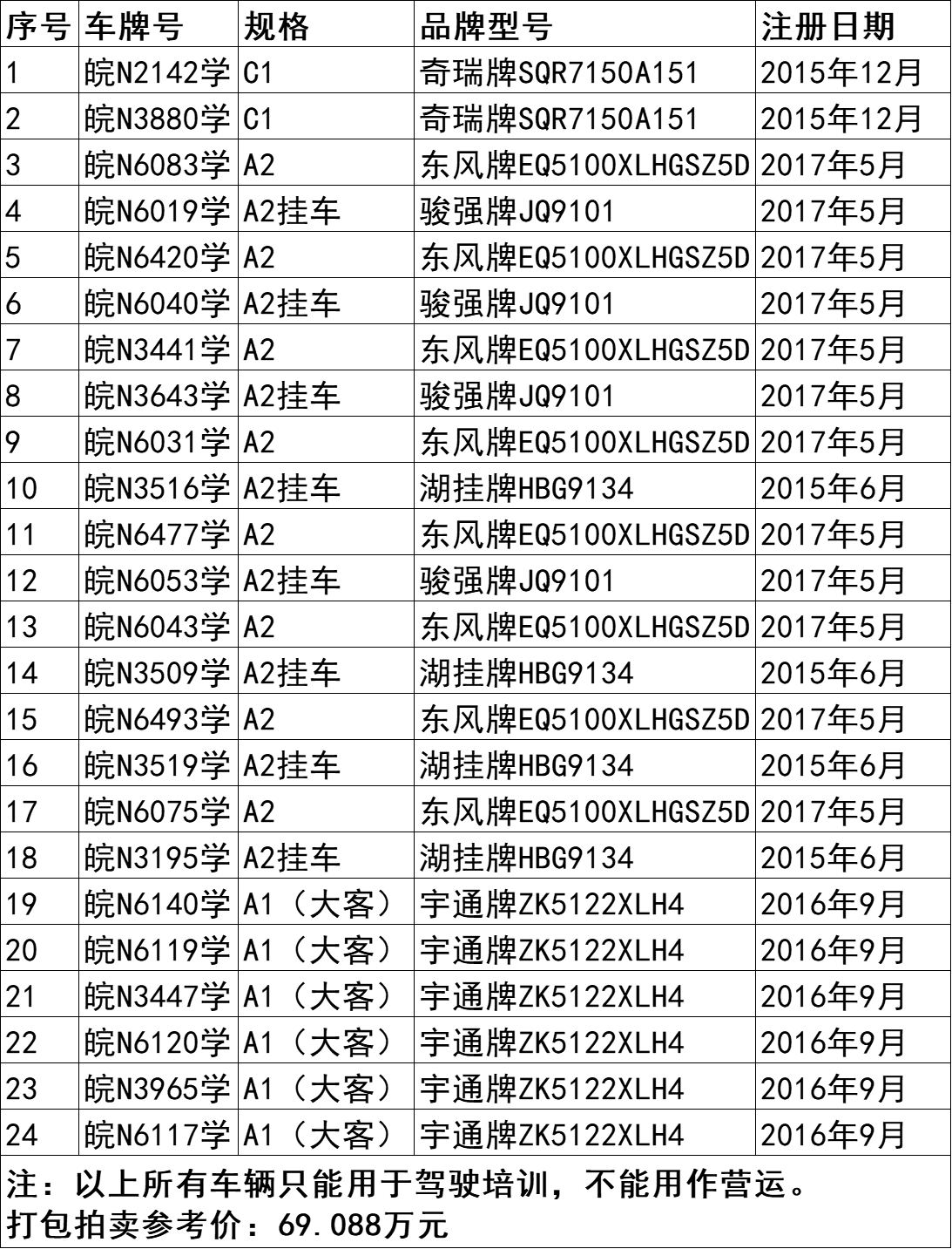 3、皖N2142學、皖N3880學奇瑞牌小轎車、皖N6140學宇通牌大客等24臺二手車,打包拍賣。參考價:69.088萬元,競買保證金:8萬元。標的詳情見下方表格: