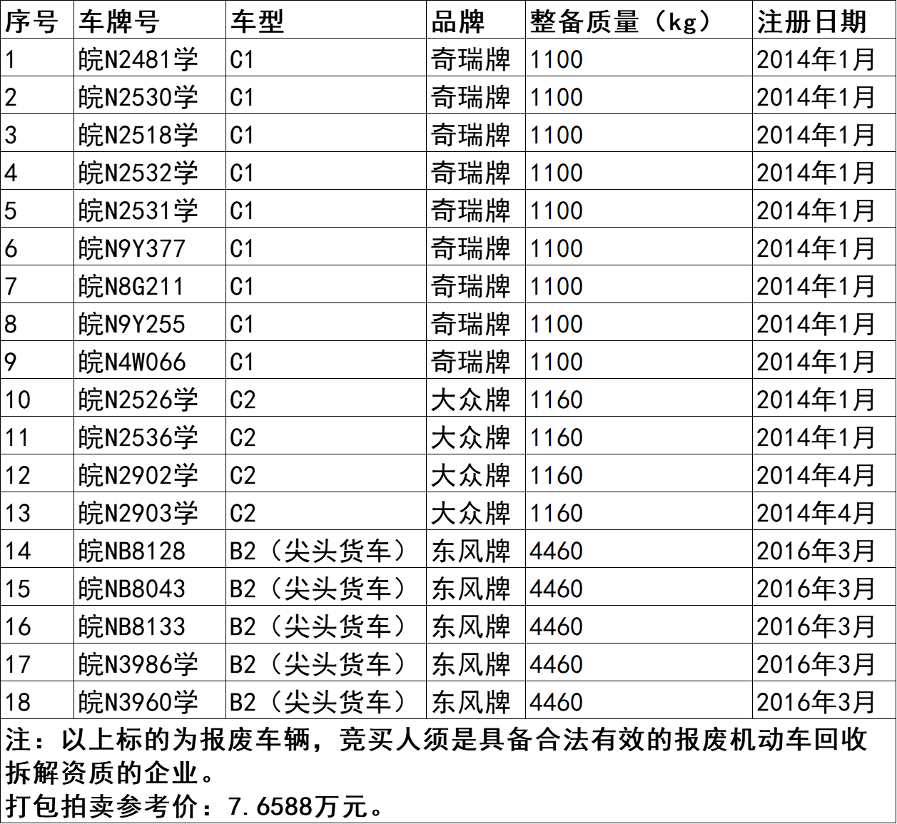 1、皖N2481學奇瑞牌小轎車、皖N2526學大眾牌小轎車、皖NB8128東風牌尖頭貨車等18臺報廢車,打包拍賣。參考價:7.6588萬元,競買保證金:2萬元。標的詳情見下方表格: